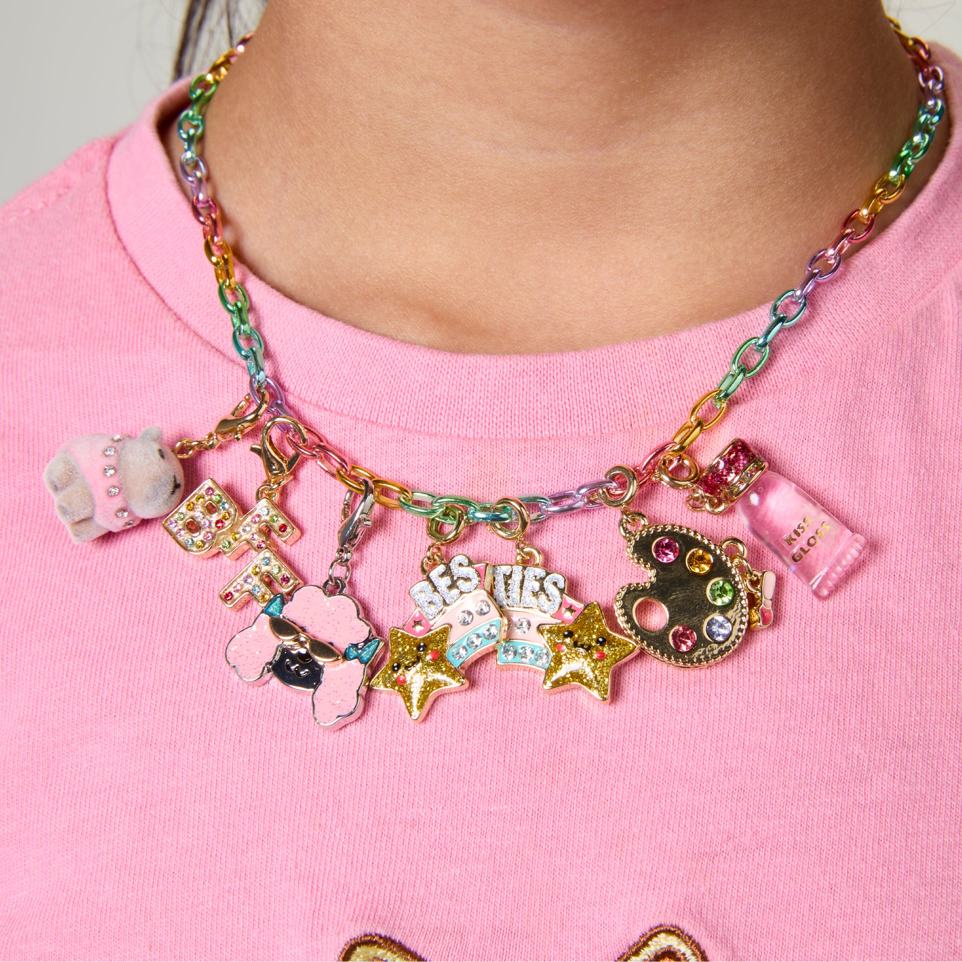 Bring the sass and the snuggles with the FAO Schwarz® Charm Squad Puppy Charm. This glam pup rocks a cotton candy pink ‘do, glittery blue bows, and gold sunglasses for the ultimate style statement. Clip it onto your bracelet, necklace, or anywhere you accessorize to show off your love for all things cute and confident. Whether you're stacking by theme or just embracing your bold side, this charm is ready to strut.