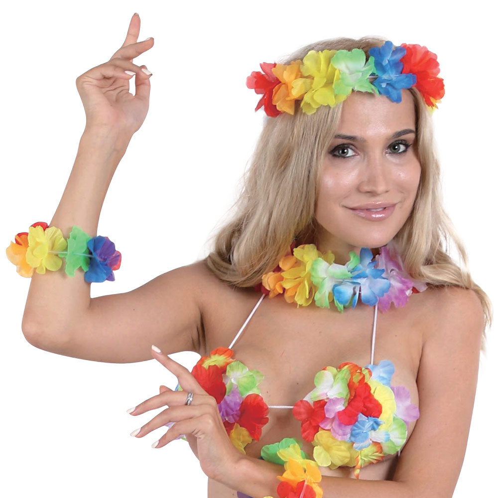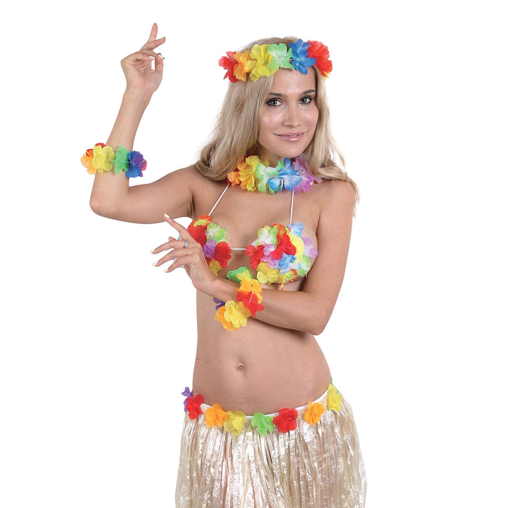 • This set includes everything you need to transform into a Hawaiian beauty, including a colorful grass skirt, a floral top, and matching headband. It's the ultimate all-in-one package for an unforgettable Hawaiian look.