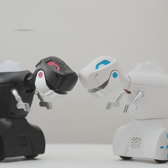 The Sharper Image® Robo Raptor Rivals brings prehistoric combat to life in an electrifying two-player RC battle set. These fierce Robo raptors are designed for intense head-to-head action, controlled by dual joystick remotes that allow players to execute spin attacks, headbutts, and strategic dodges. The innovative health tracking system uses spine lights that change from white to blue to red, providing real-time HP feedback. Each hit is accompanied by lights and roaring sound effects, immersing players in the dinosaur arena. The infrared remotes ensure responsive, interference-free control, allowing for dynamic battles from any angle. With its combination of strategic gameplay, visual effects, and prehistoric theme, Robo Raptor Rivals offers an exciting and unique RC experience. Perfect for young dinosaur enthusiasts and action-loving kids, this set promises thrilling battles where only the most skilled raptor trainer will emerge victorious.
